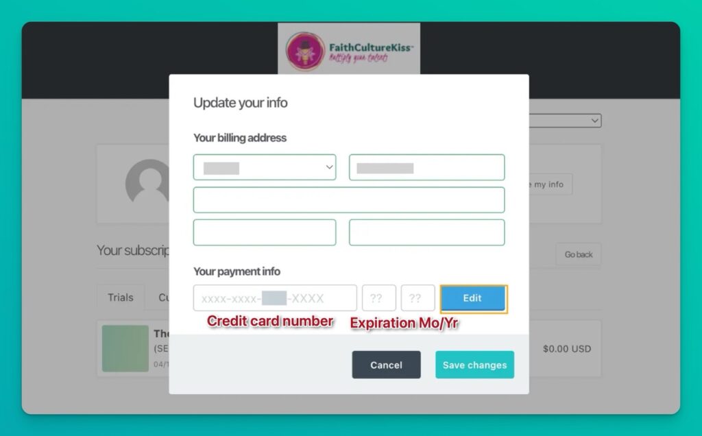 We’re here for you! If you’re experiencing any issues updating your credit card information, please reach out to our support team at hey@faithculturekiss.com.