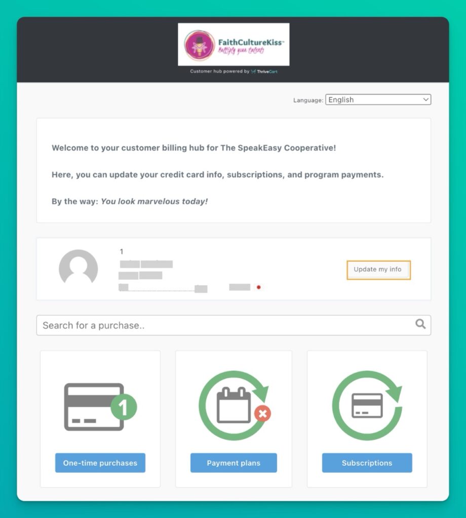 - Open the email with the subject “Update info / view purchase history” (from accounts@thrivecart.email)